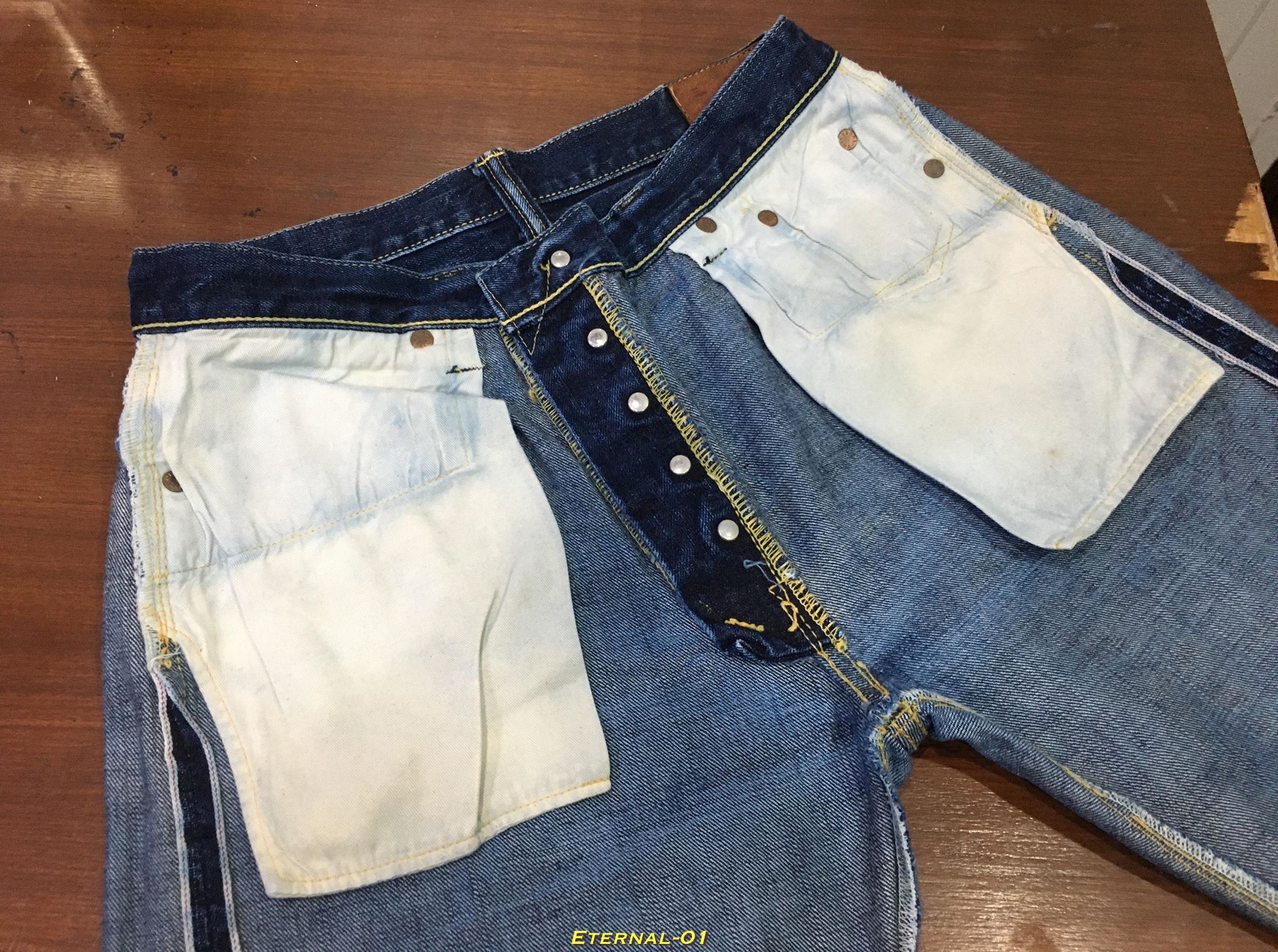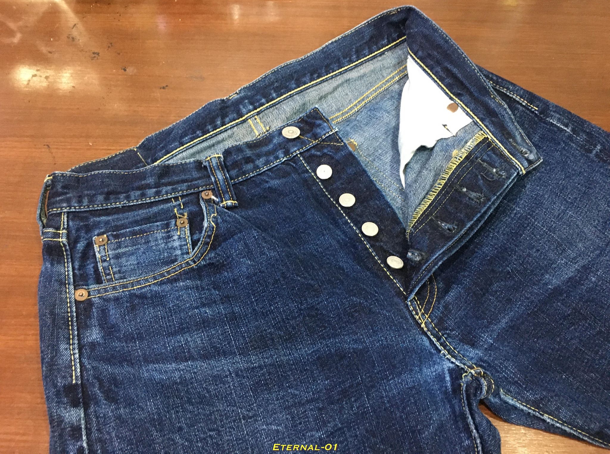ETERNAL แบรนด์ที่มีความชำนาญกับสีครามหรือ Indigo จากประเทศญี่ปุ่น ตัวงานสวย สภาพดี สีฟอกเข้มไม่มีซ่อม ไม่แก้ทรง เป้าไม่บาง ปลายขาเดิม ใช้ผ้าริมแดง Made in Japan จาก Kurashiki Selvedge Denim ตามแบบฉบับของ Eternal ของแท้ๆ รับประกันให้ตลอดอายุการใช้งานครับ