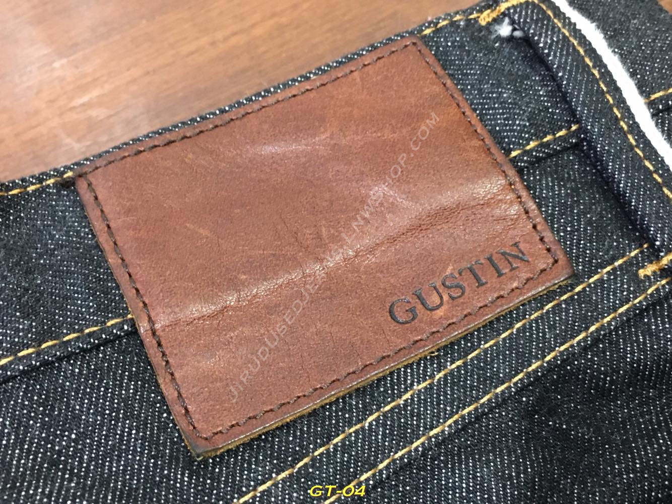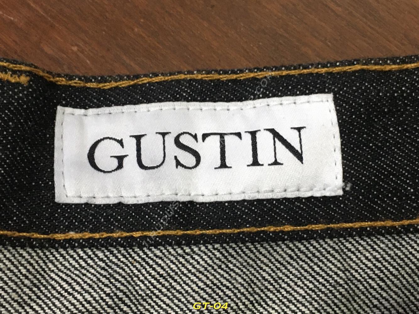 > ปลายขาเย็บ + ขอบบนกระเป๋าหลัง + และขอบบนกระเป๋าเหรียญ เย็บแบบลูกโซ่ ใช้ด้าย 2 สี (แดง+น้ำตาล) อันเป็นเอกลักษณ์ของ Gustin