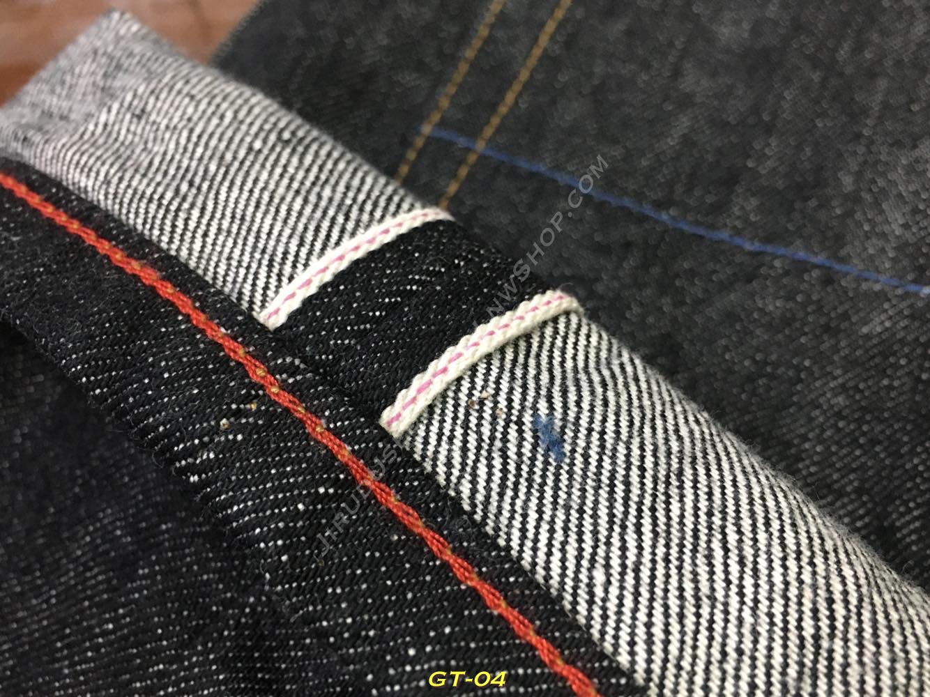 กางเกงตัวนี้ใช้ผ้าดิบญี่ปุ่น ริมชมพูเข้ม หนา 14oz. สีดำแต่ไม่ดำเกินไป โดยการทอใช้ด้ายยืน(warp) สีดำ บนด้ายพุ่ง(weft) สีขาว ทำให้ผ้าที่ออกมามี Texture สีขาว + ดำ ให้อารมณ์เหมือนผ้าดิบสีน้ำเงินที่เราคุ้นเคย และแน่นอนว่ารอยเฟดที่ออกมาก็จะให้รอยเฟดที่สวยงาม